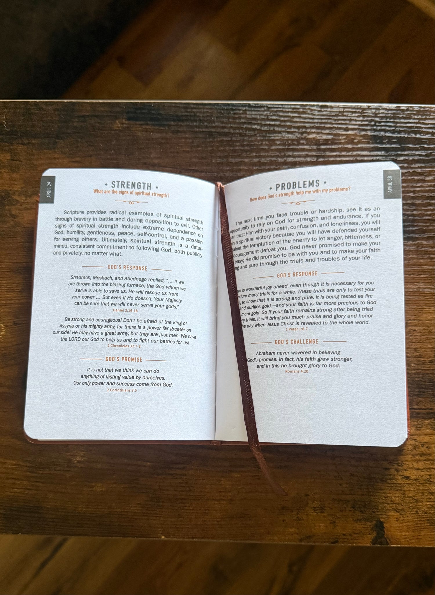 - A simple daily format: Title + guiding question + devotional insight + Scripture “God’s reply” + promise/challenge